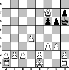 game notation in PGN-format [Event "1.Chess in Friendship"] [Site "www.myChess.de"] [Date "2004.08.10"] [Round "1"] [White "Schili"] [Black "icke"] [ECO "A16"] [WhitemyELO "1500"] [BlackmyELO "1272"] [Result "1-0"] [TimeControl "10/2592000"] [WhiteDays "80"] [BlackDays "90"] [MyChessNo "6050"] 1. c4 Nf6 2. Nc3 d5 3. cxd5 Nxd5 4. g3 b6 5. Bg2 Nb4 6. Qa4+ N4c6 7. Bxc6+ Nxc6 8. Qxc6+ Bd7 9. Qc4 b5 10. Nxb5 Rb8 11. Nxc7+ Qxc7 12. Qxc7 Rc8 13. Qxa7 g6 14. Qd4 Rg8 15. Nf3 Bg7 16. Ne5 Bc6 17. f3 f6 18. Nxc6 Rxc6 19. Qd5 Kf8 20. Qxc6 Bh6 21. d4 Kg7 22. Qd7 Rf8 23. Qxe7+ Rf7 24. Bxh6+ Kxh6 25. Qxf7 1-0 position notation in FEN-format 8/5Q1p/5ppk/8/3P4/5PP1/PPP1P2P/R3K2R - KQ - 0 25 Captured white pieces: Captured black pieces: Click on a captured piece in order to display the desired move!