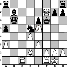 game notation in PGN-format [Event "Scottish Open"] [Site "www.myChess.de"] [Date "2007.10.22"] [Round "1"] [White "Seneca"] [Black "Andylein1989"] [ECO "D06"] [WhitemyELO "1535"] [BlackmyELO "1462"] [Result "1-0"] [TimeControl "10/864000"] [WhiteDays "11"] [BlackDays "25"] [MyChessNo "39165"] 1. d4 d5 2. c4 Nf6 3. e3 c6 4. Nf3 e6 5. Be2 Bb4+ 6. Nbd2 Nbd7 7. O-O b6 8. a3 Bxd2 9. Bxd2 c5 10. cxd5 Nxd5 11. Bc4 Bb7 12. b4 a5 13. bxc5 bxc5 14. Qc2 N7b6 15. Bb5+ Nd7 16. Qxc5 Qe7 17. Bxd7+ Qxd7 18. Ne5 Qc7 19. Qb5+ Ke7 20. Rac1 Qb6 21. Qd7+ Kf6 22. Qxf7+ 1-0 position notation in FEN-format r6r/1b3Qpp/1q2pk2/p2nN3/3P4/P3P3/3B1PPP/2R2RK1 - - - 0 22 Captured white pieces: Captured black pieces: Click on a captured piece in order to display the desired move!