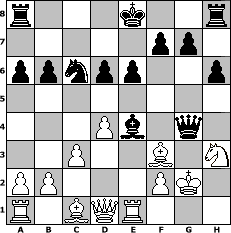 game notation in PGN-format [Event "Scottish Open"] [Site "www.myChess.de"] [Date "2007.10.22"] [Round "1"] [White "bernhard"] [Black "Juri"] [ECO "A06"] [WhitemyELO "1614"] [BlackmyELO "1485"] [Result "0-1"] [TimeControl "10/864000"] [WhiteDays "28"] [BlackDays "30"] [MyChessNo "39156"] 1. Nf3 d5 2. e3 a6 3. d4 Nc6 4. g3 Bg4 5. Be2 e6 6. O-O Qf6 7. c3 Bd6 8. Qb3 b6 9. Nbd2 Nge7 10. Qd1 Bh3 11. Re1 Nf5 12. e4 dxe4 13. Nxe4 Qe7 14. Nxd6+ cxd6 15. Ng5 Nxg3 16. hxg3 Bf5 17. g4 h6 18. Nh3 Qh4 19. Kg2 Be4+ 20. Bf3 Qxg4+ 0-1 position notation in FEN-format r3k2r/5pp1/ppnpp2p/8/3Pb1q1/2P2B1N/PP3PK1/R1BQR3 - kq - 0 21 Captured white pieces: Captured black pieces: Click on a captured piece in order to display the desired move!