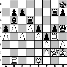 game notation in PGN-format [Event "Freizeitschach"] [Site "www.myChess.de"] [Date "2011.02.28"] [Round "1"] [White "Master1"] [Black "Knight"] [ECO "A45"] [WhitemyELO "1318"] [BlackmyELO "1153"] [Result "1/2-1/2"] [TimeControl "10/2592000"] [WhiteDays "099"] [BlackDays "118"] [MyChessNo "72357"] 1. d4 Nf6 2. e3 d5 3. Nf3 Nc6 4. Nc3 Bg4 5. Be2 e6 6. O-O Bb4 7. Bd2 O-O 8. a3 Ba5 9. h3 Bh5 10. b4 Bb6 11. b5 Na5 12. a4 Ne4 13. Rb1 Nxc3 14. Bxc3 Nc4 15. Bb4 Re8 16. Bxc4 dxc4 17. Qe2 a5 18. Bc3 f5 19. Qxc4 Bxf3 20. gxf3 Qg5+ 21. Kh1 Qh4 22. Kh2 f4 23. e4 Kh8 24. Be1 Rad8 25. Rg1 Re7 26. Rg4 Qh6 27. c3 e5 28. d5 Rd6 29. Qf1 g5 30. c4 Qh5 31. Qg1 Rg7 32. Qg2 1/2-1/2 position notation in FEN-format 7k/1pp3rp/1b1r4/pP1Pp1pq/P1P1PpR1/5P1P/5PQK/1R2B3 - - - 4 32 Captured white pieces: Captured black pieces: Click on a captured piece in order to display the desired move!