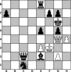 game notation in PGN-format [Event "MySchachOpen"] [Site "www.myChess.de"] [Date "2005.01.22"] [Round "1"] [White "Master1"] [Black "UPS"] [ECO "B20"] [WhitemyELO "1238"] [BlackmyELO "1638"] [Result "0-1"] [TimeControl "10/2592000"] [WhiteDays "119"] [BlackDays "120"] [MyChessNo "9881"] 1. e4 c5 2. d4 cxd4 3. Qxd4 Nc6 4. Qe3 e5 5. Nf3 Be7 6. Bb5 d6 7. Bxc6+ bxc6 8. O-O Nf6 9. Rd1 Qc7 10. Nc3 O-O 11. Bd2 Ba6 12. b3 Rfe8 13. Ng5 h6 14. Nf3 Kh7 15. a4 Rad8 16. b4 Ng4 17. Qe1 d5 18. b5 cxb5 19. axb5 Bc5 20. Nxd5 Rxd5 21. Be3 Rxd1 22. Rxd1 Bxe3 23. fxe3 Bxb5 24. c3 Nf6 25. h3 Nxe4 26. Qh4 Nxc3 27. Ng5+ Kg6 28. Qg4 hxg5 29. Rc1 Ne2+ 30. Kf2 Nxc1 31. h4 Qc2+ 32. Kf3 Be2+ 0-1 position notation in FEN-format 4r3/p4pp1/6k1/4p1p1/6QP/4PK2/2q1b1P1/2n5 - - - 3 33 Captured white pieces: Captured black pieces: Click on a captured piece in order to display the desired move!
