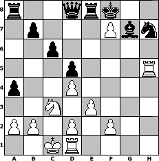 game notation in PGN-format [Event "Abtausch Variante"] [Site "www.myChess.de"] [Date "2007.02.05"] [Round "1"] [White "Knight"] [Black "Baehr008"] [ECO "D35"] [WhitemyELO "1283"] [BlackmyELO "2198"] [Result "0-1"] [TimeControl "10/1728000"] [WhiteDays "43"] [BlackDays "50"] [MyChessNo "32273"] 1. d4 d5 2. c4 e6 3. Nc3 Nf6 4. cxd5 exd5 5. Bg5 Be7 6. Bxf6 Bxf6 7. Nf3 c6 8. e3 O-O 9. Qc2 Bg4 10. Be2 Re8 11. O-O-O g6 12. h3 Bxf3 13. Bxf3 a5 14. h4 Bxh4 15. g3 Bf6 16. Bh5 gxh5 17. Rxh5 Nd7 18. Qxh7+ Kf8 19. g4 Bg7 20. g5 a4 21. g6 Nf6 22. gxf7 Nxh7 0-1 position notation in FEN-format r2qrk2/1p3Pbn/2p5/3p3R/p2P4/2N1P3/PP1P1P2/2KR4 - - - 0 23 Captured white pieces: Captured black pieces: Click on a captured piece in order to display the desired move!