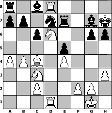 game notation in PGN-format [Event "Gary COME BACK Turnier"] [Site "www.myChess.de"] [Date "2005.03.18"] [Round "1"] [White "UPS"] [Black "Lanzelot"] [ECO "B02"] [WhitemyELO "1627"] [BlackmyELO "1658"] [Result "1-0"] [TimeControl "10/1728000"] [WhiteDays "19"] [BlackDays "20"] [MyChessNo "11270"] 1. e4 Nf6 2. Nc3 d6 3. d4 g6 4. Nf3 Bg7 5. Be2 O-O 6. h3 Nbd7 7. O-O e5 8. Bg5 c6 9. Qd2 Qc7 10. dxe5 dxe5 11. b4 Kh8 12. a4 Re8 13. Rad1 Nf8 14. Qd6 Qxd6 15. Rxd6 Ne6 16. Rfd1 Nxg5 17. Nxg5 h6 18. Nxf7+ Kh7 19. Bc4 Re7 20. Rd8 Nd7 21. Nd6 1-0 position notation in FEN-format r1bR4/pp1nr1bk/2pN2pp/4p3/PPB1P3/2N4P/2P2PP1/3R2K1 - - - 6 21 Captured white pieces: Captured black pieces: Click on a captured piece in order to display the desired move!