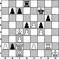 game notation in PGN-format [Event "!!!Turnier in den Sommer!!!"] [Site "www.myChess.de"] [Date "2011.03.02"] [Round "1"] [White "bjeu"] [Black "Lemmi11"] [ECO "C00"] [WhitemyELO "2086"] [BlackmyELO "1775"] [Result "1-0"] [TimeControl "10/1728000"] [WhiteDays "05"] [BlackDays "59"] [MyChessNo "72466"] 1. e4 e6 2. f4 Nc6 3. d4 d5 4. e5 Nh6 5. Nf3 Be7 6. c3 Bd7 7. Bd3 O-O 8. Qc2 Nf5 9. g4 Nh4 10. O-O Nxf3+ 11. Rxf3 g6 12. Nd2 f5 13. gxf5 exf5 14. Rg3 a5 15. Nf3 a4 16. Be3 Be6 17. Kh1 Na5 18. Rag1 Nc4 19. Bc1 Kf7 20. h4 Rg8 21. R1g2 Bxh4 22. Rh3 a3 23. Rxh4 axb2 24. Rxh7+ Rg7 25. Ng5+ Kg8 26. Rxg7+ Kxg7 27. Nxe6+ Kf7 28. Nxd8+ Rxd8 29. Bxc4 1-0 position notation in FEN-format 3r4/1pp2k2/6p1/3pPp2/2BP1P2/2P5/PpQ1P1R1/2B4K - - - 0 29 Captured white pieces: ![]() ![]() ![]() ![]() ![]() ![]() ![]() ![]() ![]() ![]() ![]() ![]() ![]() ![]() ![]() Captured black pieces: ![]() ![]() ![]() ![]() ![]() ![]() ![]() ![]() ![]() ![]() ![]() ![]() ![]() ![]() ![]() Click on a captured piece in order to display the desired move!