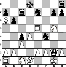 game notation in PGN-format [Event "1.Manschaftstunier der MIB-Jetzt Wirts Brutal"] [Site "www.myChess.de"] [Date "2006.05.19"] [Round "2"] [White "steff"] [Black "Oma"] [ECO "B00"] [WhitemyELO "1387"] [BlackmyELO "1001"] [Result "0-1"] [TimeControl "10/2592000"] [WhiteDays "118"] [BlackDays "100"] [MyChessNo "25542"] 1. e4 Nc6 2. Bb5 Ne5 3. d4 Ng6 4. Nc3 c6 5. Bc4 d5 6. exd5 Bf5 7. Nf3 e6 8. O-O exd5 9. Bb3 Bb4 10. Re1+ Kd7 11. Bg5 f6 12. Bd2 c5 13. Nxd5 Qf8 14. c3 Ba5 15. Be3 Rc8 16. Bd2 Qd6 17. Ba4+ Kd8 18. Ne3 Be4 19. Nc4 Qe6 20. Nxa5 b6 21. Nb3 c4 22. Nc1 Qd5 23. Bc2 N8e7 24. Bxe4 Qd6 25. Be3 f5 26. Bb7 Rc7 27. Ba6 f4 28. Ng5 Qd5 29. Bxf4 Nxf4 30. Re5 Qxg2# 0-1 position notation in FEN-format 3k3r/p1r1n1pp/Bp6/4R1N1/2pP1n2/2P5/PP2PPqP/R1NQ2K1 - - - 0 31 Captured white pieces: ![]() ![]() ![]() ![]() ![]() ![]() ![]() ![]() ![]() ![]() ![]() ![]() ![]() ![]() ![]() Captured black pieces: ![]() ![]() ![]() ![]() ![]() ![]() ![]() ![]() ![]() ![]() ![]() ![]() ![]() ![]() ![]() Click on a captured piece in order to display the desired move!