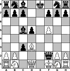game notation in PGN-format [Event "LISA OPEN #2"] [Site "www.myChess.de"] [Date "2017.10.26"] [Round "1"] [White "muellerh"] [Black "Grubengeist"] [ECO "B07"] [WhitemyELO "1495"] [BlackmyELO "2044"] [Result "0-1"] [TimeControl "10/3456000"] [WhiteDays "40"] [BlackDays "40"] [MyChessNo "110152"] 1. e4 d6 2. f4 e5 3. f5 Qh4+ 4. Ke2 Qxe4+ 5. Kf2 d5 6. c3 Bc5+ 7. d4 exd4 8. Bd3 dxc3+ 9. Be3 Qxe3+ 10. Kf1 Qf2# 0-1 position notation in FEN-format rnb1k1nr/ppp2ppp/8/2bp1P2/8/2pB4/PP3qPP/RN1Q1KNR - kq - 2 11 Captured white pieces: Captured black pieces: Click on a captured piece in order to display the desired move!