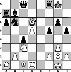 game notation in PGN-format [Event "Sommerschach 2009"] [Site "www.myChess.de"] [Date "2009.06.09"] [Round "2"] [White "Robert"] [Black "muellerh"] [ECO "A10"] [WhitemyELO "1617"] [BlackmyELO "1565"] [Result "1-0"] [TimeControl "10/864000"] [WhiteDays "08"] [BlackDays "09"] [MyChessNo "56485"] 1. c4 g6 2. g3 Bg7 3. Nc3 Nf6 4. Bg2 O-O 5. Nf3 c6 6. d4 d5 7. O-O dxc4 8. a4 a6 9. e4 b5 10. axb5 cxb5 11. Nxb5 Bb7 12. Nc3 Nxe4 13. Qe2 Nd6 14. Rd1 Ra7 15. Ne5 Qc7 16. d5 f6 17. Ng4 h5 18. Ne3 Nd7 19. Nc2 Nb6 20. Nd4 f5 21. Ne6 Qc8 22. Nxg7 Kxg7 23. Qxe7+ Kg8 24. Qxd6 1-0 position notation in FEN-format 2q2rk1/rb6/pn1Q2p1/3P1p1p/2p5/2N3P1/1P3PBP/R1BR2K1 - - - 0 24 Captured white pieces: Captured black pieces: Click on a captured piece in order to display the desired move!