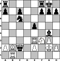 game notation in PGN-format [Event "CHESSMASTERS"] [Site "www.myChess.de"] [Date "2005.08.13"] [Round "1"] [White "Fuffy"] [Black "TAR"] [ECO "C44"] [WhitemyELO "1238"] [BlackmyELO "1477"] [Result "0-1"] [TimeControl "10/2592000"] [WhiteDays "90"] [BlackDays "58"] [MyChessNo "16171"] 1. e4 e5 2. Nf3 Nc6 3. c3 Nf6 4. d3 d5 5. Nbd2 Bc5 6. Nb3 Bb6 7. Qc2 dxe4 8. dxe4 Ng4 9. Bd3 Nxf2 10. Qxf2 Bxf2+ 11. Kxf2 Qxd3 12. Nc5 Qb5 13. b4 b6 14. Kg3 bxc5 15. Bb2 cxb4 16. cxb4 Qxb4 17. Rab1 Qxe4 18. Rhe1 Qf4+ 19. Kf2 O-O 20. Re3 Bg4 21. g3 Qf5 22. Kg2 Qc2+ 0-1 position notation in FEN-format r4rk1/p1p2ppp/2n5/4p3/6b1/4RNP1/PBq1P1KP/1R6 - - - 3 23 Captured white pieces: Captured black pieces: Click on a captured piece in order to display the desired move!