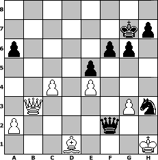 game notation in PGN-format [Event "Spanisch"] [Site "www.myChess.de"] [Date "2016.12.30"] [Round "1"] [White "beowulf"] [Black "atlantis"] [ECO "C89"] [WhitemyELO "1357"] [BlackmyELO "1814"] [Result "0-1"] [TimeControl "10/1728000"] [WhiteDays "20"] [BlackDays "16"] [MyChessNo "106217"] 1. e4 e5 2. Nf3 Nc6 3. Bb5 a6 4. Ba4 Nf6 5. O-O Be7 6. Re1 b5 7. Bb3 O-O 8. c3 d6 9. h3 Na5 10. Bc2 c5 11. d4 Nc6 12. dxc5 dxc5 13. Bg5 Qc7 14. Qe2 c4 15. Nbd2 Nh5 16. Bxe7 Nf4 17. Qf1 Qxe7 18. Rad1 Bb7 19. g3 Ng6 20. Qe2 Rfd8 21. Nf1 Bc8 22. Rxd8+ Nxd8 23. Ne3 f6 24. Rd1 Bxh3 25. Nd5 Qb7 26. Kh2 Bg4 27. Ne3 Bxf3 28. Qxf3 Nf7 29. Nd5 Rd8 30. b3 Ne7 31. bxc4 bxc4 32. Nxe7+ Qxe7 33. Rxd8+ Qxd8 34. Qe2 Qb6 35. Qxc4 Qxf2+ 36. Kh1 g6 37. Qb3 Kg7 38. c4 Ng5 39. Bd1 Nh3 0-1 position notation in FEN-format 8/6kp/p4pp1/4p3/2P1P3/1Q4Pn/P4q2/3B3K - - - 3 40 Captured white pieces: ![]() ![]() ![]() ![]() ![]() ![]() ![]() ![]() ![]() ![]() ![]() ![]() ![]() ![]() ![]() Captured black pieces: ![]() ![]() ![]() ![]() ![]() ![]() ![]() ![]() ![]() ![]() ![]() ![]() ![]() ![]() ![]() Click on a captured piece in order to display the desired move!