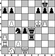 game notation in PGN-format [Event "Carpe Diem 2"] [Site "www.myChess.de"] [Date "2007.08.11"] [Round "1"] [White "MichaelKnopf"] [Black "hollst"] [ECO "A00"] [WhitemyELO "1438"] [BlackmyELO "1500"] [Result "0-1"] [TimeControl "10/1728000"] [WhiteDays "51"] [BlackDays "60"] [MyChessNo "37250"] 1. g3 Nf6 2. Bg2 d5 3. e3 e5 4. Ne2 Be7 5. O-O O-O 6. d4 e4 7. f3 exf3 8. Bxf3 Bh3 9. Bg2 Bxg2 10. Kxg2 c5 11. Nbc3 Nc6 12. a3 Re8 13. dxc5 Bxc5 14. b4 Bxe3 15. b5 Na5 16. Bxe3 Rxe3 17. h3 d4 18. Nb1 Nc4 19. Ra2 Nh5 20. Rf3 Rxf3 21. Kxf3 Qf6+ 22. Nf4 Qg5 23. Nxh5 Qxh5+ 24. g4 Qxh3+ 25. Kf2 Qh2+ 26. Kf3 Re8 27. g5 Re3+ 28. Kg4 Qg2+ 29. Kf5 Qe4# 0-1 position notation in FEN-format 6k1/pp3ppp/8/1P3KP1/2npq3/P3r3/R1P5/1N1Q4 - - - 5 30 Captured white pieces: ![]() ![]() ![]() ![]() ![]() ![]() ![]() ![]() ![]() ![]() ![]() ![]() ![]() ![]() ![]() Captured black pieces: ![]() ![]() ![]() ![]() ![]() ![]() ![]() ![]() ![]() ![]() ![]() ![]() ![]() ![]() ![]() Click on a captured piece in order to display the desired move!