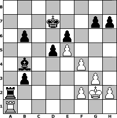 game notation in PGN-format [Event "unter uns Nr. 51"] [Site "www.myChess.de"] [Date "2022.01.26"] [Round "1"] [White "Mynona"] [Black "hsvler"] [ECO "A45"] [WhitemyELO "1386"] [BlackmyELO "1279"] [Result "0-1"] [TimeControl "10/864000"] [WhiteDays "30"] [BlackDays "26"] [MyChessNo "124424"] 1. d4 Nf6 2. Bf4 d5 3. e3 Nc6 4. c4 e6 5. c5 b6 6. cxb6 axb6 7. Bb5 Bd7 8. Bxc6 Bxc6 9. Qc2 Qd7 10. Nf3 Nh5 11. Ne5 Qd6 12. Qxc6+ Qxc6 13. Nxc6 Nxf4 14. exf4 Bd6 15. g3 f6 16. a3 Kd7 17. Ne5+ fxe5 18. dxe5 Bb4+ 19. Ke2 Bc5 20. b4 Bxb4 21. Nd2 Bxa3 22. Ra2 Bb4 23. Rxa8 Rxa8 24. Nb3 Ra2+ 25. Kf1 c5 26. Kg2 c4 27. Ra1 cxb3 0-1 position notation in FEN-format 8/3k2pp/1p2p3/3pP3/1b3P2/1p4P1/r4PKP/R7 - - - 0 28 Captured white pieces: Captured black pieces: Click on a captured piece in order to display the desired move!