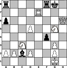 game notation in PGN-format [Event "1.Chess in Friendship"] [Site "www.myChess.de"] [Date "2004.08.10"] [Round "1"] [White "Knight"] [Black "Master1"] [ECO "D00"] [WhitemyELO "1389"] [BlackmyELO "1186"] [Result "1-0"] [TimeControl "10/2592000"] [WhiteDays "120"] [BlackDays "120"] [MyChessNo "6058"] 1. d4 d5 2. e4 dxe4 3. Nc3 Nf6 4. f3 e6 5. Bg5 h6 6. Bh4 g5 7. Bg3 exf3 8. Nxf3 Nh5 9. Be5 f6 10. Bg3 Nxg3 11. hxg3 Nc6 12. Bb5 e5 13. O-O a6 14. Bxc6+ bxc6 15. Re1 f5 16. Rxe5+ Be7 17. d5 O-O 18. Nh2 Bd6 19. Re3 Bc5 20. Qe2 Bxe3+ 21. Qxe3 Re8 22. Qd4 Re7 23. Qf6 Rf7 24. Qxd8+ Kg7 25. Nf3 Rf8 26. Qxc7+ Kg8 27. Qxc6 f4 28. Qg6+ Kh8 29. Qxh6+ Kg8 30. Nxg5 Bf5 31. Re1 Bxc2 32. Re7 1-0 position notation in FEN-format r4rk1/4R3/p6Q/3P2N1/5p2/2N3P1/PPbP2P1/6K1 - - - 1 32 Captured white pieces: Captured black pieces: Click on a captured piece in order to display the desired move!