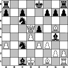 game notation in PGN-format [Event "Trotz Sturm und Regen die Figuren bewegen"] [Site "www.myChess.de"] [Date "2020.03.16"] [Round "1"] [White "beowulf"] [Black "spiderman"] [ECO "A10"] [WhitemyELO "1338"] [BlackmyELO "1824"] [Result "0-1"] [TimeControl "10/2592000"] [WhiteDays "30"] [BlackDays "24"] [MyChessNo "117552"] 1. c4 Nc6 2. Nc3 Nf6 3. Nf3 e6 4. d4 Bb4 5. Qc2 d5 6. Bg5 dxc4 7. a3 Ba5 8. e3 b5 9. b4 cxb3 10. Qxb3 Qd5 11. Qb2 Ne4 12. Rc1 e5 13. Nd2 Bxc3 14. Qxb5 Bxd2+ 15. Kd1 Bg4+ 16. f3 Bxc1 17. Qxd5 Nc3+ 0-1 position notation in FEN-format r3k2r/p1p2ppp/2n5/3Qp1B1/3P2b1/P1n1PP2/6PP/2bK1B1R - kq - 1 18 Captured white pieces: Captured black pieces: Click on a captured piece in order to display the desired move!