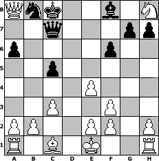 game notation in PGN-format [Event "2.HSF-Clubmeisterschaften 2011/12 Gruppe B"] [Site "www.myChess.de"] [Date "2011.09.01"] [Round "1"] [White "woern63"] [Black "beowulf"] [ECO "B22"] [WhitemyELO "1898"] [BlackmyELO "1386"] [Result "1-0"] [TimeControl "10/2592000"] [WhiteDays "25"] [BlackDays "30"] [MyChessNo "75960"] 1. e4 c5 2. c3 e5 3. Nf3 d6 4. d4 Bg4 5. Bb5+ Nd7 6. dxe5 dxe5 7. Qd5 Bxf3 8. Qxe5+ Ne7 9. Nd2 f6 10. Nc4 Qb8 11. Nd6+ Kd8 12. Nf7+ Kc8 13. Qe6 Nc6 14. gxf3 a6 15. Bxc6 bxc6 16. Qxc6+ Qc7 17. Qxa8+ Nb8 18. Nxh8 1-0 position notation in FEN-format Qnk2b1N/2q3pp/p4p2/2p5/4P3/2P2P2/PP2PP1P/R1B1K2R - KQ - 0 18 Captured white pieces: ![]() ![]() ![]() ![]() ![]() ![]() ![]() ![]() ![]() ![]() ![]() ![]() ![]() ![]() ![]() Captured black pieces: ![]() ![]() ![]() ![]() ![]() ![]() ![]() ![]() ![]() ![]() ![]() ![]() ![]() ![]() ![]() Click on a captured piece in order to display the desired move!