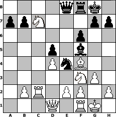 game notation in PGN-format [Event "MySchachOpen"] [Site "www.myChess.de"] [Date "2005.01.22"] [Round "1"] [White "icke"] [Black "Bernd"] [ECO "A06"] [WhitemyELO "1242"] [BlackmyELO "1382"] [Result "1-0"] [TimeControl "10/2592000"] [WhiteDays "56"] [BlackDays "00"] [MyChessNo "9851"] 1. Nf3 d5 2. d4 Nf6 3. Nc3 Nc6 4. Bf4 e6 5. g3 Bb4 6. a3 Ne4 7. axb4 Nxb4 8. Bh3 f6 9. O-O O-O 10. Nb5 Qd7 11. Bxe6+ Qxe6 12. Nxc7 Qc6 13. Nxa8 Nxc2 14. Rc1 Bf5 15. Rxc2 Qe8 16. Nc7 1-0 position notation in FEN-format 4qrk1/ppN3pp/5p2/3p1b2/3PnB2/5NP1/1PR1PP1P/3Q1RK1 - - - 2 16 Captured white pieces: Captured black pieces: Click on a captured piece in order to display the desired move!