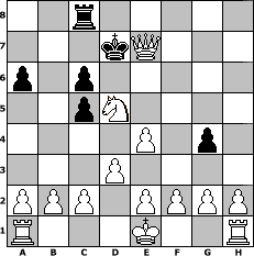 game notation in PGN-format [Event "Ostdeutschland"] [Site "www.myChess.de"] [Date "2008.08.12"] [Round "1"] [White "thw"] [Black "Damenmatt"] [ECO "C68"] [WhitemyELO "1584"] [BlackmyELO "1479"] [Result "1-0"] [TimeControl "10/2592000"] [WhiteDays "90"] [BlackDays "78"] [MyChessNo "47111"] 1. e4 e5 2. Nf3 Nc6 3. Bb5 a6 4. Bxc6 bxc6 5. Nxe5 c5 6. Qf3 f6 7. Qh5+ g6 8. Nxg6 hxg6 9. Qxh8 Nh6 10. Qh7 g5 11. Qg6+ Nf7 12. Nc3 d6 13. d3 g4 14. Nd5 Be6 15. Nxf6+ Ke7 16. Bg5 d5 17. Nxd5+ Kd7 18. Bxd8 Kxd8 19. Qxe6 Rc8 20. Qxf7 c6 21. Qxf8+ Kd7 22. Qe7# 1-0 position notation in FEN-format 2r5/3kQ3/p1p5/2pN4/4P1p1/3P4/PPP1PPPP/R3K2R - KQ - 2 22 Captured white pieces: ![]() ![]() ![]() ![]() ![]() ![]() ![]() ![]() ![]() ![]() ![]() ![]() ![]() ![]() ![]() Captured black pieces: ![]() ![]() ![]() ![]() ![]() ![]() ![]() ![]() ![]() ![]() ![]() ![]() ![]() ![]() ![]() Click on a captured piece in order to display the desired move!