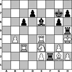 game notation in PGN-format [Event "Svetlana Open 2012"] [Site "www.myChess.de"] [Date "2012.03.22"] [Round "1"] [White "Naunhofer"] [Black "kari6katz"] [ECO "C45"] [WhitemyELO "1654"] [BlackmyELO "1758"] [Result "0-1"] [TimeControl "10/2592000"] [WhiteDays "30"] [BlackDays "30"] [MyChessNo "80749"] 1. e4 e5 2. Nf3 Nc6 3. d4 exd4 4. Nxd4 Bc5 5. Be3 Qf6 6. c3 Nge7 7. b4 Nxd4 8. bxc5 Ne6 9. Bd4 Qg6 10. Nd2 b6 11. cxb6 axb6 12. g3 Bb7 13. Bg2 Ng5 14. f3 Ba6 15. f4 O-O 16. fxg5 Qxg5 17. c4 Nc6 18. Nf3 Qa5+ 19. Qd2 Qxd2+ 20. Kxd2 Bxc4 21. a3 f6 22. Rhc1 Ra4 23. Bc3 Re8 24. Re1 Na5 25. Bxa5 Rxa5 26. Nd4 g6 27. Rac1 b5 28. Rc3 c6 29. Nc2 Kg7 30. Ke3 f5 31. Kf4 fxe4 32. Rxe4 Rf8+ 33. Kg4 Rf2 34. Ne3 Be6+ 35. Kh4 b4 36. axb4 Rh5# 0-1 position notation in FEN-format 8/3p2kp/2p1b1p1/7r/1P2R2K/2R1N1P1/4PrBP/8 - - - 1 37 Captured white pieces: ![]() ![]() ![]() ![]() ![]() ![]() ![]() ![]() ![]() ![]() ![]() ![]() ![]() ![]() ![]() Captured black pieces: ![]() ![]() ![]() ![]() ![]() ![]() ![]() ![]() ![]() ![]() ![]() ![]() ![]() ![]() ![]() Click on a captured piece in order to display the desired move!