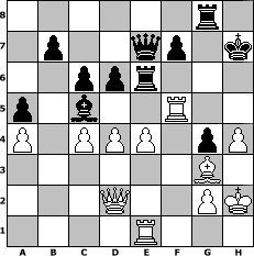 game notation in PGN-format [Event "Fr"] [Site "www.myChess.de"] [Date "2012.03.14"] [Round "1"] [White "pepo47"] [Black "Svetlana"] [ECO "C55"] [WhitemyELO "1991"] [BlackmyELO "1767"] [Result "1-0"] [TimeControl "10/2592000"] [WhiteDays "27"] [BlackDays "26"] [MyChessNo "80627"] 1. e4 e5 2. Nf3 Nc6 3. Bc4 Nf6 4. d3 Bc5 5. Nc3 O-O 6. Bg5 h6 7. Bh4 d6 8. Nd5 g5 9. Bg3 Na5 10. h4 g4 11. Nd2 Nxc4 12. Nxf6+ Qxf6 13. Nxc4 Be6 14. Ne3 h5 15. O-O a5 16. a4 c6 17. c3 Rad8 18. Re1 Rfe8 19. Rb1 Rd7 20. b3 Qg6 21. Qe2 Kg7 22. Nc4 Bxc4 23. bxc4 Rde7 24. Qd2 Kg8 25. Re2 Kh7 26. Rd1 Kg7 27. Qb2 Qf6 28. Rf1 Kg8 29. Kh2 Rd8 30. f3 Kh7 31. Qd2 Re6 32. Ree1 Qe7 33. fxg4 hxg4 34. Rf5 Rg8 35. d4 exd4 36. cxd4 1-0 position notation in FEN-format 6r1/1p2qp1k/2ppr3/p1b2R2/P1PPP1pP/6B1/3Q2PK/4R3 - - - 0 36 Captured white pieces: ![]() ![]() ![]() ![]() ![]() ![]() ![]() ![]() ![]() ![]() ![]() ![]() ![]() ![]() ![]() Captured black pieces: ![]() ![]() ![]() ![]() ![]() ![]() ![]() ![]() ![]() ![]() ![]() ![]() ![]() ![]() ![]() Click on a captured piece in order to display the desired move!