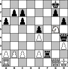 game notation in PGN-format [Event "3. Frankenwaldturnier"] [Site "www.myChess.de"] [Date "2007.05.07"] [Round "1"] [White "thw"] [Black "Andreas"] [ECO "C68"] [WhitemyELO "1563"] [BlackmyELO "1670"] [Result "0-1"] [TimeControl "10/1728000"] [WhiteDays "20"] [BlackDays "20"] [MyChessNo "34617"] 1. e4 e5 2. Nf3 Nc6 3. Bb5 a6 4. Bxc6 dxc6 5. O-O Bg4 6. h3 Bh5 7. d3 Nf6 8. Bg5 Be7 9. Nbd2 O-O 10. g4 Bxg4 11. Bxf6 Bxf3 12. Bxe7 Qxe7 13. Nxf3 Qe6 14. Kh2 f5 15. Ng5 Qh6 16. Rg1 Qh4 17. Ne6 Rf7 18. Rg2 fxe4 19. dxe4 Re8 20. Ng5 Rxf2 21. Qg1 Ref8 22. Kh1 h6 23. Rxf2 Rxf2 0-1 position notation in FEN-format 6k1/1pp3p1/p1p4p/4p1N1/4P2q/7P/PPP1Pr2/R5QK - - - 0 24 Captured white pieces: ![]() ![]() ![]() ![]() ![]() ![]() ![]() ![]() ![]() ![]() ![]() ![]() ![]() ![]() ![]() Captured black pieces: ![]() ![]() ![]() ![]() ![]() ![]() ![]() ![]() ![]() ![]() ![]() ![]() ![]() ![]() ![]() Click on a captured piece in order to display the desired move!