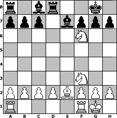 game notation in PGN-format [Event "ComeBack"] [Site "www.myChess.de"] [Date "2008.11.09"] [Round "1"] [White "Knight"] [Black "Juliette2103"] [ECO "A45"] [WhitemyELO "1153"] [BlackmyELO "1516"] [Result "1-0"] [TimeControl "10/1728000"] [WhiteDays "40"] [BlackDays "00"] [MyChessNo "49655"] 1. d4 Nf6 2. Nc3 e6 3. e4 d5 4. Bg5 dxe4 5. Nxe4 Be7 6. Bxf6 Bxf6 7. Nf3 O-O 8. Be2 Nd7 9. O-O Be7 10. d5 exd5 11. Qxd5 Nf6 12. Qxd8 Rxd8 13. Nxf6+ 1-0 position notation in FEN-format r1br2k1/ppp1bppp/5N2/8/8/5N2/PPPPBPPP/R4RK1 - - - 0 13 Captured white pieces: ![]() ![]() ![]() ![]() ![]() ![]() ![]() ![]() ![]() ![]() ![]() ![]() ![]() ![]() ![]() Captured black pieces: ![]() ![]() ![]() ![]() ![]() ![]() ![]() ![]() ![]() ![]() ![]() ![]() ![]() ![]() ![]() Click on a captured piece in order to display the desired move!