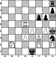 game notation in PGN-format [Event "Dabei ist alles 3"] [Site "www.myChess.de"] [Date "2008.05.14"] [Round "1"] [White "Ostseeboy"] [Black "Knight"] [ECO "C44"] [WhitemyELO "1340"] [BlackmyELO "1255"] [Result "1-0"] [TimeControl "10/864000"] [WhiteDays "10"] [BlackDays "08"] [MyChessNo "44856"] 1. e4 e5 2. Nf3 Nc6 3. Be2 Nf6 4. O-O Bc5 5. Nc3 d6 6. d3 Bg4 7. a3 a5 8. Bd2 O-O 9. b3 Bxf3 10. Bxf3 Nd4 11. Na4 Nxf3+ 12. Qxf3 Bd4 13. c3 Ba7 14. b4 axb4 15. axb4 b5 16. Nb2 c5 17. bxc5 Bxc5 18. g3 Rxa1 19. Rxa1 g6 20. Be3 Bxe3 21. Qxe3 d5 22. Ra7 d4 23. cxd4 exd4 24. Qf4 b4 25. Rb7 Kg7 26. Rxb4 Qa5 27. Rxd4 Qe1+ 28. Kg2 Nh5 29. Qe5+ f6 30. Rd7+ Kh6 31. Qe7 Rh8 32. g4 Nf4+ 33. Kf3 Nh3 34. Qg7+ Kg5 35. Rd5+ Kh4 36. Qh6# 1-0 position notation in FEN-format 7r/7p/5ppQ/3R4/4P1Pk/3P1K1n/1N3P1P/4q3 - - - 8 36 Captured white pieces: Captured black pieces: Click on a captured piece in order to display the desired move!