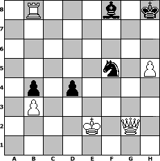game notation in PGN-format [Event "Osterei 2015"] [Site "www.myChess.de"] [Date "2015.04.05"] [Round "1"] [White "rux"] [Black "borsti"] [ECO "C45"] [WhitemyELO "1462"] [BlackmyELO "1357"] [Result "1-0"] [TimeControl "10/2592000"] [WhiteDays "198"] [BlackDays "210"] [MyChessNo "98820"] 1. e4 e5 2. Nf3 Nc6 3. d4 exd4 4. Nxd4 d5 5. Bb5 Nge7 6. e5 a6 7. Ba4 Bd7 8. Bb3 Nxd4 9. Qxd4 Be6 10. O-O Nc6 11. Qf4 g6 12. Qg3 Bc5 13. Bh6 Qe7 14. Bg5 Qd7 15. Bf6 Rg8 16. Nd2 Nd4 17. Qh4 h5 18. Rae1 Nf5 19. Qf4 Bd4 20. c3 Bc5 21. Ba4 b5 22. Bb3 a5 23. a4 b4 24. Ra1 c6 25. Rad1 Be7 26. Ne4 O-O-O 27. Nc5 Bxc5 28. Bxd8 Rxd8 29. c4 Qc7 30. cxd5 Bxd5 31. Bxd5 Rxd5 32. Rxd5 cxd5 33. g3 Kd7 34. Re1 Bd4 35. e6+ fxe6 36. Qxc7+ Kxc7 37. Rxe6 g5 38. b3 g4 39. Rg6 Ng7 40. Kg2 Be5 41. f4 gxf3+ 42. Kxf3 Kd7 43. g4 hxg4+ 44. Kg2 Ne6 45. Rxg4 Nf4+ 46. Kf3 Nd3 47. Rg5 Ke6 48. h4 Bf4 49. Rg6+ Kf5 50. Rg1 Nc5 51. Rg4 Bh6 52. h5 Nd7 53. Rg6 Bf8 54. Ra6 d4 55. Rxa5+ Ne5+ 56. Ke2 Kf6 57. Kd1 Bg7 58. Rb5 Bf8 59. a5 Ng4 60. a6 Bd6 61. a7 Ne3+ 62. Ke2 Kg7 63. a8=Q Bf8 64. Rb6 Nf5 65. Qg2+ Kh8 66. Rb8 1-0 position notation in FEN-format 1R3b1k/8/8/5n1P/1p1p4/1P6/4K1Q1/8 - - - 6 66 Captured white pieces: Captured black pieces: Click on a captured piece in order to display the desired move!