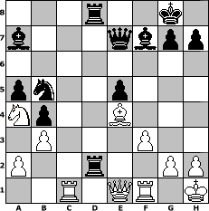 game notation in PGN-format [Event "Wems gef"] [Site "www.myChess.de"] [Date "2006.01.13"] [Round "1"] [White "wasserandy"] [Black "Robur"] [Variant "Fischerrandom"] [SetUp "1"] [FEN "nbrkqnbr/pppppppp/8/8/8/8/PPPPPPPP/NBRKQNBR w KQkq - 0 1"] [WhitemyELO "1842"] [BlackmyELO "1701"] [Result "0-1"] [TimeControl "10/864000"] [WhiteDays "08"] [BlackDays "05"] [MyChessNo "21647"] 1. f3 Ng6 2. c3 f6 3. Bc2 d6 4. Bb3 Bf7 5. Ng3 b6 6. Nf5 Qf8 7. d4 c6 8. Bf2 e6 9. Ne3 Qe7 10. Nac2 O-O 11. Qd2 Rfd8 12. O-O Nc7 13. c4 e5 14. Nf5 Qd7 15. Rfd1 Qxf5 16. Nb4 Qd7 17. dxe5 Nxe5 18. Bg3 a5 19. Bxe5 fxe5 20. Nd3 Qe7 21. e4 Ba7 22. Kh1 Ne6 23. Bc2 Nd4 24. Bb1 Rc7 25. b3 Bh5 26. Rf1 Rcd7 27. Nb2 Bf7 28. Rf2 b5 29. Rff1 Bb6 30. Qf2 Ba7 31. Qd2 Bb6 32. Qf2 Ba7 33. Qd2 b4 34. Na4 d5 35. exd5 cxd5 36. cxd5 Rxd5 37. Qe1 Nb5 38. Be4 Rd2 0-1 position notation in FEN-format 3r2k1/b3qbpp/8/pn2p3/Np2B3/1P3P2/P2r2PP/2R1QR1K - - - 4 39 Captured white pieces: Captured black pieces: Click on a captured piece in order to display the desired move!
