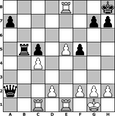 game notation in PGN-format [Event "Spa"] [Site "www.myChess.de"] [Date "2008.10.21"] [Round "1"] [White "Master1"] [Black "bluescreenlover"] [ECO "D20"] [WhitemyELO "1252"] [BlackmyELO "1258"] [Result "1-0"] [TimeControl "10/2592000"] [WhiteDays "73"] [BlackDays "73"] [MyChessNo "48938"] 1. d4 d5 2. c4 dxc4 3. e4 b5 4. Nc3 e6 5. Nxb5 Bb4+ 6. Nc3 Bxc3+ 7. bxc3 Ba6 8. Nf3 Ne7 9. Ne5 Nbc6 10. Bxc4 Bxc4 11. Nxc4 Rb8 12. O-O O-O 13. e5 Qd5 14. Ne3 Qb5 15. Ba3 Qa5 16. Bxe7 Nxe7 17. c4 c5 18. d5 Rfd8 19. d6 Nf5 20. Nxf5 exf5 21. Re1 Qc3 22. Rc1 Qa5 23. Qd5 Kh8 24. Qxf7 Qxa2 25. d7 Rb5 26. Qe8+ Rxe8 27. dxe8=Q# 1-0 position notation in FEN-format 4R2k/p5pp/8/1rp1Pp2/2P5/8/q2P1PPP/2R1R1K1 - - - 0 27 Captured white pieces: Captured black pieces: Click on a captured piece in order to display the desired move!