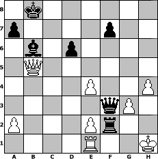 game notation in PGN-format [Event "Hoffnung"] [Site "www.myChess.de"] [Date "2017.03.10"] [Round "1"] [White "Seneca"] [Black "espero"] [ECO "C51"] [WhitemyELO "1513"] [BlackmyELO "1833"] [Result "0-1"] [TimeControl "10/1728000"] [WhiteDays "20"] [BlackDays "20"] [MyChessNo "107294"] 1. e4 e5 2. Nf3 Nc6 3. Bc4 Bc5 4. b4 Bxb4 5. c3 Bc5 6. d4 exd4 7. O-O d6 8. cxd4 Bb6 9. d5 Na5 10. Bb2 Ne7 11. Bxg7 Rg8 12. Bb5+ c6 13. dxc6 bxc6 14. Bf6 cxb5 15. Nc3 Qd7 16. Rb1 Bb7 17. Re1 O-O-O 18. Rxb5 Kb8 19. Rh5 Rg6 20. Bxe7 Qxe7 21. Rxh7 Rdg8 22. g3 Nc4 23. Nd5 Bxd5 24. Qxd5 Rf6 25. Kg2 Ne5 26. Nxe5 Rxf2+ 27. Kh1 Qxe5 28. Qb3 Rh8 29. Rxh8+ Qxh8 30. h4 Qf6 31. Qb5 Qf3+ 0-1 position notation in FEN-format 1k6/p4p2/1b1p4/1Q6/4P2P/5qP1/P3Pr2/4R2K - - - 3 32 Captured white pieces: Captured black pieces: Click on a captured piece in order to display the desired move!