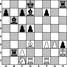 game notation in PGN-format [Event "Gary COME BACK Turnier"] [Site "www.myChess.de"] [Date "2005.03.18"] [Round "1"] [White "UPS"] [Black "Juliette2103"] [ECO "C45"] [WhitemyELO "1627"] [BlackmyELO "1804"] [Result "0-1"] [TimeControl "10/1728000"] [WhiteDays "00"] [BlackDays "19"] [MyChessNo "11281"] 1. e4 e5 2. Nf3 Nc6 3. d4 exd4 4. Nxd4 Nf6 5. Nxc6 bxc6 6. Bd3 d5 7. e5 Ng4 8. O-O Bc5 9. Bf4 g5 10. Bg3 h5 11. Be2 Rb8 12. h3 h4 13. Bh2 Nxh2 14. Kxh2 Qe7 15. Nd2 Qxe5+ 16. Kh1 Rxb2 17. Bd3 Qf4 18. Qe2+ Kd8 19. Rae1 g4 20. hxg4 Bxg4 21. Qe5 Qxe5 22. Rxe5 Bd4 23. Ree1 h3 24. g3 Rxa2 25. f3 Bc8 26. Nb3 Bb6 27. Kh2 c5 28. Nc1 Rb2 29. Rd1 Bd7 0-1 position notation in FEN-format 3k3r/p1pb1p2/1b6/2pp4/8/3B1PPp/1rP4K/2NR1R2 - - - 4 30 Captured white pieces: Captured black pieces: Click on a captured piece in order to display the desired move!