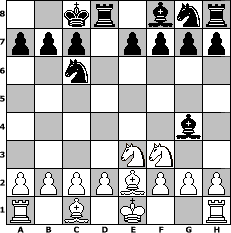 game notation in PGN-format [Event "Only for friends"] [Site "www.myChess.de"] [Date "2005.02.24"] [Round "1"] [White "Andylein1989"] [Black "TAR"] [ECO "B01"] [WhitemyELO "1257"] [BlackmyELO "1561"] [Result "1-0"] [TimeControl "10/1728000"] [WhiteDays "20"] [BlackDays "00"] [MyChessNo "10641"] 1. e4 d5 2. exd5 Qxd5 3. Nc3 Qe6+ 4. Qe2 Nc6 5. Nf3 Qxe2+ 6. Bxe2 Bg4 7. Nd5 O-O-O 8. Ne3 1-0 position notation in FEN-format 2kr1bnr/ppp1pppp/2n5/8/6b1/4NN2/PPPPBPPP/R1B1K2R - KQ - 4 8 Captured white pieces: Captured black pieces: Click on a captured piece in order to display the desired move!