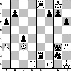 game notation in PGN-format [Event "Schlusslichterturnier Nr.2"] [Site "www.myChess.de"] [Date "2010.10.25"] [Round "1"] [White "hape50"] [Black "Steffi"] [ECO "C44"] [WhitemyELO "1352"] [BlackmyELO "1527"] [Result "0-1"] [TimeControl "10/2592000"] [WhiteDays "30"] [BlackDays "30"] [MyChessNo "69316"] 1. e4 e5 2. Nf3 Nc6 3. Be2 Nf6 4. a3 Nxe4 5. d3 Nf6 6. Nc3 Be7 7. Be3 d5 8. Na2 O-O 9. h3 h6 10. c3 a6 11. Qc2 Re8 12. O-O Be6 13. d4 exd4 14. Nxd4 Nxd4 15. Bxd4 Nd7 16. b3 Rc8 17. Qb2 c5 18. Be3 Bf6 19. Qc2 Nf8 20. f4 d4 21. Bd2 Bxb3 22. Qxb3 Rxe2 23. Rad1 Qc7 24. cxd4 Bxd4+ 25. Kh1 c4 26. Qf3 Rce8 27. Nc3 Bxc3 28. Bxc3 Ng6 29. Qd5 Nxf4 30. Qf3 Nxg2 31. Qg3 Qxg3 0-1 position notation in FEN-format 4r1k1/1p3pp1/p6p/8/2p5/P1B3qP/4r1n1/3R1R1K - - - 0 32 Captured white pieces: Captured black pieces: Click on a captured piece in order to display the desired move!