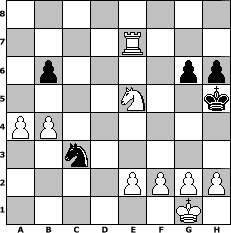 game notation in PGN-format [Event "Mit Sizialisch in den Herbst!"] [Site "www.myChess.de"] [Date "2005.09.22"] [Round "1"] [White "chessmike"] [Black "Falcor"] [ECO "B33"] [WhitemyELO "2033"] [BlackmyELO "1685"] [Result "1-0"] [TimeControl "10/1728000"] [WhiteDays "20"] [BlackDays "20"] [MyChessNo "17710"] 1. e4 c5 2. Nf3 Nc6 3. d4 cxd4 4. Nxd4 Nf6 5. Nc3 d6 6. Bg5 e5 7. Ndb5 Be7 8. Bxf6 Bxf6 9. Nxd6+ Kf8 10. Bc4 Be6 11. Bxe6 fxe6 12. O-O Qe7 13. Ndb5 Kf7 14. Qh5+ g6 15. Qh3 Kg7 16. Rae1 Rhd8 17. Na3 Rd2 18. Rd1 Rad8 19. Nd5 exd5 20. Rxd2 d4 21. Qb3 b6 22. c3 dxc3 23. Rxd8 Nxd8 24. Qxc3 Ne6 25. Rc1 Qd6 26. Nc4 Qc5 27. Ne3 Bg5 28. Qxc5 Nxc5 29. b4 Nxe4 30. Rc7+ Kh6 31. Rxa7 Nc3 32. Ng4+ Kh5 33. Nxe5 h6 34. a4 Be7 35. Rxe7 1-0 position notation in FEN-format 8/4R3/1p4pp/4N2k/PP6/2n5/4PPPP/6K1 - - - 0 35 Captured white pieces: Captured black pieces: Click on a captured piece in order to display the desired move!