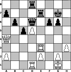 game notation in PGN-format [Event "Caissa und die wei"] [Site "www.myChess.de"] [Date "2007.07.21"] [Round "1"] [Board "1"] [White "GIM1961"] [Black "Grubengeist"] [ECO "B09"] [WhitemyELO "2045"] [BlackmyELO "1809"] [Result "0-1"] [TimeControl "10/2592000"] [WhiteDays "10"] [BlackDays "30"] [MyChessNo "36625"] 1. e4 d6 2. d4 Nf6 3. Nc3 g6 4. f4 Bg7 5. Nf3 c5 6. Bb5+ Bd7 7. e5 Ng4 8. Bxd7+ Qxd7 9. d5 dxe5 10. h3 e4 11. Nxe4 Nf6 12. Nxf6+ Bxf6 13. O-O O-O 14. Ne5 Qd6 15. Be3 Nd7 16. Nxd7 Qxd7 17. c4 Bxb2 18. Rb1 Bf6 19. Qc2 b6 20. f5 Rfe8 21. fxg6 hxg6 22. Rf3 Bg7 23. Rbf1 Rf8 24. Qd2 e6 25. Bh6 exd5 26. Bxg7 Kxg7 27. cxd5 Rad8 28. Rd1 f6 29. Qc2 Qd6 30. Qa4 Rf7 31. Re3 Re7 0-1 position notation in FEN-format 3r4/p3r1k1/1p1q1pp1/2pP4/Q7/4R2P/P3P1P1/3R2K1 - - - 6 32 Captured white pieces: Captured black pieces: Click on a captured piece in order to display the desired move!