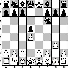 game notation in PGN-format [Event "Mannschaftswettkampf 2014"] [Site "www.myChess.de"] [Date "2014.09.04"] [Round "2"] [Board "4"] [White "SibylleSchwerdt"] [Black "Knight"] [ECO "A15"] [WhitemyELO "1764"] [BlackmyELO "1308"] [Result "0-1"] [TimeControl "10/2592000"] [WhiteDays "30"] [BlackDays "30"] [MyChessNo "95707"] 1. c4 Nf6 2. d4 e6 3. g3 d5 4. cxd5 exd5 0-1 position notation in FEN-format rnbqkb1r/ppp2ppp/5n2/3p4/3P4/6P1/PPP1PP1P/RNBQKBNR - KQkq - 0 5 Captured white pieces: Captured black pieces: Click on a captured piece in order to display the desired move!