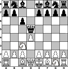 game notation in PGN-format [Event "Regensommer"] [Site "www.myChess.de"] [Date "2012.06.20"] [Round "1"] [White "UPS"] [Black "Duschgel"] [ECO "B13"] [WhitemyELO "1651"] [BlackmyELO "1572"] [Result "1-0"] [TimeControl "10/1728000"] [WhiteDays "18"] [BlackDays "00"] [MyChessNo "82390"] 1. e4 c6 2. d4 d5 3. exd5 Qxd5 4. Nc3 1-0 position notation in FEN-format rnb1kbnr/pp2pppp/2p5/3q4/3P4/2N5/PPP1PPPP/R1BQKBNR - KQkq - 1 4 Captured white pieces: Captured black pieces: Click on a captured piece in order to display the desired move!