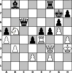 game notation in PGN-format [Event "Es wird bald Sommer"] [Site "www.myChess.de"] [Date "2015.05.12"] [Round "2"] [White "reisinger"] [Black "Joschi"] [ECO "A56"] [WhitemyELO "1534"] [BlackmyELO "1574"] [Result "0-1"] [TimeControl "10/2592000"] [WhiteDays "30"] [BlackDays "30"] [MyChessNo "99227"] 1. d4 Nf6 2. c4 c5 3. e3 cxd4 4. exd4 d5 5. Nc3 Nc6 6. c5 Bf5 7. Nf3 e6 8. a3 a5 9. Qa4 Be7 10. Ne5 Rc8 11. Bb5 Qc7 12. Bf4 Qd8 13. Nxc6 bxc6 14. Bxc6+ Kf8 15. Bb7 Nh5 16. Bxc8 Nxf4 17. g3 Nd3+ 18. Ke2 Qxc8 19. Rab1 Nxc5 20. dxc5 Bxb1 21. Rxb1 Qxc5 22. Kf3 g6 23. Qf4 Kg7 24. Rc1 Qd6 25. Qa4 Ra8 26. Nb5 Qb6 27. Qb3 Rb8 28. a4 Bf6 29. Kg2 Bd4 30. Rc2 Be5 31. Qf3 Qb7 32. Kg1 Rc8 33. Re2 Bb8 34. b3 Qc6 35. h4 Qc1+ 36. Kg2 Qc6 37. g4 e5 38. Kh3 d4 39. Re4 Rf8 40. g5 f5 0-1 position notation in FEN-format 1b3r2/6kp/2q3p1/pN2ppP1/P2pR2P/1P3Q1K/3P1P2/8 - - - 0 41 Captured white pieces: Captured black pieces: Click on a captured piece in order to display the desired move!