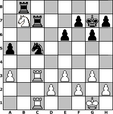 game notation in PGN-format [Event "1. Haithabu-Spiele"] [Site "www.myChess.de"] [Date "2008.08.15"] [Round "1"] [Board "4"] [White "reisinger"] [Black "Seneca"] [ECO "A42"] [WhitemyELO "1443"] [BlackmyELO "1465"] [Result "1/2-1/2"] [TimeControl "10/2592000"] [WhiteDays "30"] [BlackDays "24"] [MyChessNo "47195"] 1. d4 d6 2. c4 Nf6 3. Nc3 g6 4. b4 Bg7 5. Nf3 O-O 6. Bb2 a6 7. e3 Nbd7 8. Qc2 e6 9. c5 dxc5 10. dxc5 c6 11. Ne4 Nxe4 12. Bxg7 Kxg7 13. Qxe4 a5 14. Qd4+ Nf6 15. b5 Qxd4 16. Nxd4 cxb5 17. Bxb5 Bd7 18. O-O Bxb5 19. Nxb5 Nd5 20. Rfc1 Rfc8 21. Rab1 Nb4 22. Nd6 Rc6 23. a3 Nd3 24. Rc3 Nxc5 25. Nxb7 Rb8 26. g3 Rc7 27. Rbc1 1/2-1/2 position notation in FEN-format 1r6/1Nr2pkp/4p1p1/p1n5/8/P1R1P1P1/3P1P1P/2R3K1 - - - 2 27 Captured white pieces: Captured black pieces: Click on a captured piece in order to display the desired move!