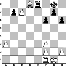 game notation in PGN-format [Event "Skandinavium II"] [Site "www.myChess.de"] [Date "2006.01.06"] [Round "1"] [White "Joschi"] [Black "Caligula"] [ECO "B01"] [WhitemyELO "1720"] [BlackmyELO "1394"] [Result "1-0"] [TimeControl "10/864000"] [WhiteDays "09"] [BlackDays "10"] [MyChessNo "21443"] 1. e4 d5 2. exd5 Nf6 3. d4 Qxd5 4. c4 Qe4+ 5. Ne2 e6 6. Nbc3 Qc6 7. Ng3 h6 8. d5 Qd6 9. Be2 exd5 10. Nxd5 Nxd5 11. Qxd5 Qb4+ 12. Qd2 Nc6 13. O-O Bc5 14. a3 Qxd2 15. Bxd2 O-O 16. b4 Bd4 17. Rad1 Be6 18. Bf4 Rac8 19. b5 Be5 20. Be3 Na5 21. c5 Nc4 22. Bc1 Na5 23. Ne4 Bb3 24. Rd7 Rcd8 25. Re7 Rd5 26. b6 axb6 27. cxb6 Nc6 28. Rxc7 Bxc7 29. bxc7 Ne7 30. Be3 Rd7 31. Nc5 Be6 32. Nxd7 Bxd7 33. Bc5 Re8 34. Bf3 Bc6 35. Bxe7 Bxf3 36. gxf3 f6 37. Bd8 1-0 position notation in FEN-format 3Br1k1/1pP3p1/5p1p/8/8/P4P2/5P1P/5RK1 - - - 1 37 Captured white pieces: Captured black pieces: Click on a captured piece in order to display the desired move!