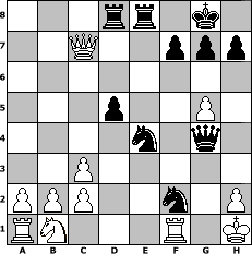 game notation in PGN-format [Event "Herbstturnier"] [Site "www.myChess.de"] [Date "2004.11.18"] [Round "1"] [White "Hobbykegler"] [Black "Chelly"] [ECO "A00"] [WhitemyELO "1086"] [BlackmyELO "1613"] [Result "0-1"] [TimeControl "10/864000"] [WhiteDays "16"] [BlackDays "21"] [MyChessNo "8177"] 1. c3 d5 2. d4 Nf6 3. Be3 Bf5 4. g3 e6 5. Bf4 Bd6 6. Qd2 Nc6 7. Bxd6 Qxd6 8. Nf3 O-O 9. Nh4 Bg6 10. Bh3 Ne7 11. O-O Rad8 12. Nxg6 Nxg6 13. Qe3 Rfe8 14. g4 e5 15. dxe5 Qxe5 16. Qxa7 Nf4 17. Qxb7 Nxh3+ 18. Kg2 Qxe2 19. Qxc7 Ne4 20. g5 Qg4+ 21. Kh1 Nhxf2+ 0-1 position notation in FEN-format 3rr1k1/2Q2ppp/8/3p2P1/4n1q1/2P5/PPP2n1P/RN3R1K - - - 0 22 Captured white pieces: Captured black pieces: Click on a captured piece in order to display the desired move!