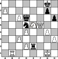 game notation in PGN-format [Event "LASKER 2016/1916"] [Site "www.myChess.de"] [Date "2016.10.26"] [Round "1"] [White "Robur"] [Black "Seneca"] [ECO "D57"] [WhitemyELO "1828"] [BlackmyELO "1513"] [Result "1-0"] [TimeControl "10/2592000"] [WhiteDays "46"] [BlackDays "90"] [MyChessNo "105410"] 1. d4 d5 2. c4 e6 3. Nc3 Nf6 4. Bg5 Be7 5. e3 O-O 6. Nf3 h6 7. Bh4 Ne4 8. Bxe7 Qxe7 9. cxd5 Nxc3 10. bxc3 exd5 11. Bd3 Bg4 12. O-O c6 13. h3 Bh5 14. Rb1 b5 15. g4 Bg6 16. Bxg6 fxg6 17. Ne5 Qd6 18. Qc2 Rf6 19. f4 Nd7 20. a4 a6 21. e4 Raf8 22. exd5 Rxf4 23. Rxf4 Rxf4 24. Nxg6 Rf3 25. dxc6 Nf6 26. Ne5 Rg3+ 27. Kh2 Re3 28. axb5 Nd5 29. bxa6 Kf8 30. Qf5+ Kg8 31. a7 Re2+ 32. Kg1 1-0 position notation in FEN-format 6k1/P5p1/2Pq3p/3nNQ2/3P2P1/2P4P/3Pr3/1R4K1 - - - 2 32 Captured white pieces: Captured black pieces: Click on a captured piece in order to display the desired move!