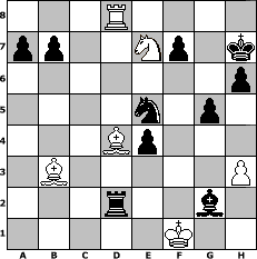 game notation in PGN-format [Event "7erD2"] [Site "www.myChess.de"] [Date "2011.10.14"] [Round "2"] [White "Sanji"] [Black "sprinterde"] [ECO "C42"] [WhitemyELO "1537"] [BlackmyELO "1678"] [Result "0-1"] [TimeControl "10/3456000"] [WhiteDays "40"] [BlackDays "40"] [MyChessNo "76789"] 1. e4 e5 2. Nf3 Nf6 3. Nc3 d6 4. Bc4 Bg4 5. O-O Be7 6. h3 Bh5 7. d3 O-O 8. Bg5 Nbd7 9. g4 Bg6 10. Nh4 Nxe4 11. Bxe7 Nxc3 12. Bxd8 Nxd1 13. Bxc7 Nxb2 14. Bb3 Rfc8 15. Bxd6 Rc6 16. Ba3 Nxd3 17. cxd3 Bxd3 18. Rfd1 e4 19. Nf5 Ra6 20. Bb4 Ne5 21. Rac1 Be2 22. Rd5 Nd3 23. Rc8+ Rxc8 24. Ne7+ Kh8 25. Nxc8 h6 26. Rd8+ Kh7 27. Bd2 Ne5 28. Be3 Nf3+ 29. Kg2 Ne5 30. Bc2 Bf3+ 31. Kg1 Rxa2 32. Bb3 Ra1+ 33. Kh2 Rh1+ 34. Kg3 g5 35. Bd4 Rg1+ 36. Kh2 Rg2+ 37. Kh1 Rxg4+ 38. Kh2 Rg2+ 39. Kh1 Rxf2+ 40. Kg1 Rg2+ 41. Kf1 Rd2 42. Ne7 Bg2+ 0-1 position notation in FEN-format 3R4/pp2Np1k/7p/4n1p1/3Bp3/1B5P/3r2b1/5K2 - - - 6 43 Captured white pieces: Captured black pieces: Click on a captured piece in order to display the desired move!