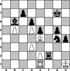game notation in PGN-format [Event "Eine zentrale Er"] [Site "www.myChess.de"] [Date "2009.05.20"] [Round "2"] [White "Knight"] [Black "murphy12"] [ECO "C65"] [WhitemyELO "1098"] [BlackmyELO "1596"] [Result "0-1"] [TimeControl "10/2592000"] [WhiteDays "146"] [BlackDays "150"] [MyChessNo "55945"] 1. e4 e5 2. Nf3 Nc6 3. Bb5 Nf6 4. Nc3 Bc5 5. O-O O-O 6. d3 d6 7. Bg5 Be6 8. Nd5 Bxd5 9. exd5 Nd4 10. Nxd4 Bxd4 11. c3 Bb6 12. c4 h6 13. Bh4 g5 14. Bg3 a6 15. Ba4 Bd4 16. Rb1 b5 17. cxb5 axb5 18. Bxb5 Rxa2 19. Qd2 Nh5 20. Kh1 f5 21. h3 f4 22. Bh2 f3 23. g3 Ng7 24. Qb4 Nf5 25. g4 Nh4 26. Bg3 Ng2 27. Qd2 Qf6 28. Bd7 Kg7 29. Bf5 Rb8 30. Rfc1 Qe7 31. Rc2 Rba8 32. h4 gxh4 33. Bh2 Ra1 34. Rcc1 Rxb1 35. Rxb1 Qg5 36. Qxg5+ hxg5 37. b4 Bxf2 38. Rc1 Bb6 39. b5 Ne3 40. Be4 Rf8 41. Bg1 f2 42. Bxf2 Rxf2 43. Re1 Nxg4 0-1 position notation in FEN-format 8/2p3k1/1b1p4/1P1Pp1p1/4B1np/3P4/4Pr2/4R2K - - - 0 44 Captured white pieces: Captured black pieces: Click on a captured piece in order to display the desired move!