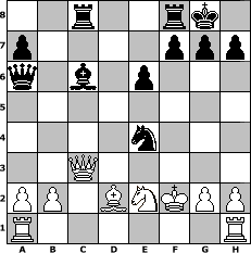 game notation in PGN-format [Event "Wrixum - Open die IX"] [Site "www.myChess.de"] [Date "2011.10.15"] [Round "1"] [White "Sanji"] [Black "Tomino"] [ECO "B10"] [WhitemyELO "1537"] [BlackmyELO "1768"] [Result "0-1"] [TimeControl "10/2592000"] [WhiteDays "90"] [BlackDays "67"] [MyChessNo "76899"] 1. e4 c6 2. c4 d5 3. cxd5 cxd5 4. exd5 Nf6 5. d4 Nxd5 6. Nc3 Nc6 7. Bc4 Be6 8. Qf3 Nxd4 9. Qe4 Nf6 10. Bb5+ Nxb5 11. Qxb7 Nxc3 12. Qc6+ Bd7 13. Qxc3 e6 14. Nf3 Rc8 15. Qb3 Qa5+ 16. Bd2 Qa6 17. Nd4 Bc5 18. Ne2 O-O 19. Qf3 Bc6 20. Qc3 Bxf2+ 21. Kxf2 Ne4+ 0-1 position notation in FEN-format 2r2rk1/p4ppp/q1b1p3/8/4n3/2Q5/PP1BNKPP/R6R - - - 1 22 Captured white pieces: ![]() ![]() ![]() ![]() ![]() ![]() ![]() ![]() ![]() ![]() ![]() ![]() ![]() ![]() ![]() Captured black pieces: ![]() ![]() ![]() ![]() ![]() ![]() ![]() ![]() ![]() ![]() ![]() ![]() ![]() ![]() ![]() Click on a captured piece in order to display the desired move!