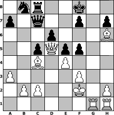 game notation in PGN-format [Event "MySchachOpen"] [Site "www.myChess.de"] [Date "2005.01.22"] [Round "2"] [White "bjeu"] [Black "tschulz"] [ECO "B06"] [WhitemyELO "1667"] [BlackmyELO "1514"] [Result "1-0"] [TimeControl "10/2592000"] [WhiteDays "90"] [BlackDays "20"] [MyChessNo "9902"] 1. e4 g6 2. Nf3 Bg7 3. d4 d6 4. Nc3 c6 5. Bc4 b5 6. Bd3 Qa5 7. Bd2 b4 8. Ne2 Bg4 9. a3 Bxf3 10. gxf3 Qh5 11. Ng3 Qh3 12. Bxb4 Bxd4 13. Bf1 Bxf2+ 14. Kxf2 Qh4 15. Qd4 Qf6 16. Bc3 e5 17. Qb4 Nh6 18. Qb7 O-O 19. Qxa8 Qe7 20. Bd2 Qc7 21. Bxh6 Rc8 22. Be3 c5 23. Qd5 Qb6 24. Bc4 Qc7 25. Nf5 gxf5 26. Rag1+ Kf8 27. Bh6+ 1-0 position notation in FEN-format 1nr2k2/p1q2p1p/3p3B/2pQpp2/2B1P3/P4P2/1PP2K1P/6RR - - - 3 27 Captured white pieces: Captured black pieces: Click on a captured piece in order to display the desired move!