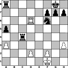 game notation in PGN-format [Event "FINEST GREEN"] [Site "www.myChess.de"] [Date "2009.10.15"] [Round "1"] [White "Master1"] [Black "Caligula"] [ECO "D02"] [WhitemyELO "1314"] [BlackmyELO "1362"] [Result "0-1"] [TimeControl "10/864000"] [WhiteDays "06"] [BlackDays "10"] [MyChessNo "59844"] 1. d4 d5 2. Nf3 Nf6 3. Bf4 Nc6 4. Nc3 e6 5. Nb5 Bd6 6. Bxd6 cxd6 7. e3 a6 8. Nc3 O-O 9. Bd3 e5 10. dxe5 dxe5 11. e4 d4 12. O-O dxc3 13. bxc3 Bg4 14. h3 Bh5 15. Rb1 b5 16. a3 Bg6 17. Re1 Re8 18. c4 bxc4 19. Bxc4 Qxd1 20. Rbxd1 Bxe4 21. Bd3 Bxf3 22. gxf3 a5 23. Bb5 Rec8 24. Rd6 Nd4 25. Rxe5 Nxf3+ 26. Kf1 Nxe5 27. c4 Nxc4 28. Bxc4 Rxc4 0-1 position notation in FEN-format r5k1/5ppp/3R1n2/p7/2r5/P6P/3P1P2/5K2 - - - 0 29 Captured white pieces: Captured black pieces: Click on a captured piece in order to display the desired move!