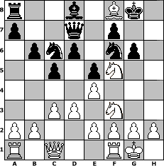 game notation in PGN-format [Event "Februar 2018"] [Site "www.myChess.de"] [Date "2018.02.03"] [Round "1"] [White "Andylein1989"] [Black "Seneca"] [ECO "C41"] [WhitemyELO "1677"] [BlackmyELO "1426"] [Result "1-0"] [TimeControl "10/1728000"] [WhiteDays "40"] [BlackDays "19"] [MyChessNo "111275"] 1. e4 e5 2. Nf3 d6 3. Bc4 h6 4. c3 Be6 5. Bb3 Nf6 6. d3 Bxb3 7. Qxb3 b6 8. Nbd2 Nc6 9. Nf1 Be7 10. Ng3 Qd7 11. Bd2 O-O 12. O-O Na5 13. Qd1 c5 14. Nf5 Nc6 15. Qc1 Bd8 16. Bxh6 g6 17. Bxf8 1-0 position notation in FEN-format r2b1Bk1/p2q1p2/1pnp1np1/2p1pN2/4P3/2PP1N2/PP2PPPP/R1Q2RK1 - - - 0 17 Captured white pieces: Captured black pieces: Click on a captured piece in order to display the desired move!