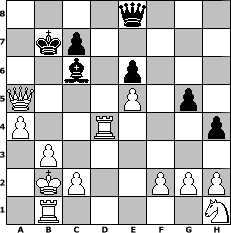 game notation in PGN-format [Event "mit 960 in den November 2012"] [Site "www.myChess.de"] [Date "2012.11.05"] [Round "1"] [White "reisender"] [Black "wiesel"] [Variant "Fischerrandom"] [SetUp "1"] [FEN "brkbqnrn/pppppppp/8/8/8/8/PPPPPPPP/BRKBQNRN w KQkq - 0 1"] [WhitemyELO "1361"] [BlackmyELO "1172"] [Result "1-0"] [TimeControl "10/1728000"] [WhiteDays "59"] [BlackDays "57"] [MyChessNo "84910"] 1. b3 e6 2. e3 b6 3. d4 d5 4. Bb2 Nhg6 5. Nd2 h6 6. Bh5 f5 7. Nf3 Bf6 8. Ne5 Bxe5 9. dxe5 Nd7 10. Bd4 Bc6 11. a4 a5 12. Qc3 Nc5 13. Bxc5 bxc5 14. Qxc5 Ra8 15. Bxg6 Qd7 16. Rd1 Ra6 17. e4 fxe4 18. Bxe4 Rf8 19. Qxf8+ Kb7 20. Bd3 d4 21. Bxa6+ Kxa6 22. Qc5 g5 23. Rxd4 Qe8 24. Qc4+ Kb7 25. Qc5 h5 26. Qxa5 h4 27. Kb2 1-0 position notation in FEN-format 4q3/1kp5/2b1p3/Q3P1p1/P2R3p/1P6/1KP2PPP/1R5N - - - 1 27 Captured white pieces: Captured black pieces: Click on a captured piece in order to display the desired move!
