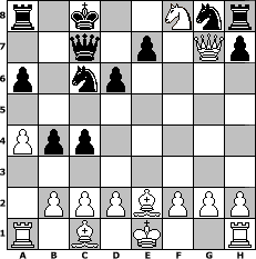 game notation in PGN-format [Event "Alt Benoni"] [Site "www.myChess.de"] [Date "2017.09.25"] [Round "1"] [White "Erich"] [Black "Joschi"] [ECO "A43"] [WhitemyELO "2150"] [BlackmyELO "1576"] [Result "1-0"] [TimeControl "10/2592000"] [WhiteDays "60"] [BlackDays "60"] [MyChessNo "109685"] 1. d4 c5 2. d5 Nf6 3. Nf3 c4 4. Nc3 a6 5. e4 b5 6. e5 Ng8 7. Be2 d6 8. e6 fxe6 9. dxe6 Bxe6 10. Ng5 Qd7 11. a4 b4 12. Nd5 Bxd5 13. Qxd5 Nc6 14. Qf7+ Kd8 15. Ne6+ Kc8 16. Nxf8 Qc7 17. Qxg7 1-0 position notation in FEN-format r1k2Nnr/2q1p1Qp/p1np4/8/Ppp5/8/1PPPBPPP/R1B1K2R - KQ - 0 17 Captured white pieces: Captured black pieces: Click on a captured piece in order to display the desired move!