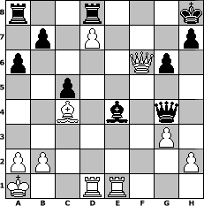 game notation in PGN-format [Event "Albspiele 5"] [Site "www.myChess.de"] [Date "2010.07.03"] [Round "1"] [White "reisender"] [Black "Haki"] [ECO "E76"] [WhitemyELO "1431"] [BlackmyELO "1274"] [Result "1-0"] [TimeControl "10/1728000"] [WhiteDays "20"] [BlackDays "20"] [MyChessNo "66768"] 1. d4 Nf6 2. c4 g6 3. Nc3 Bg7 4. e4 d6 5. f4 O-O 6. Nf3 c5 7. d5 e6 8. Be3 exd5 9. cxd5 Qe7 10. Qc2 a6 11. O-O-O Ng4 12. Qd2 Nxe3 13. Qxe3 Nd7 14. g3 Nb6 15. Be2 Bxc3 16. Qxc3 f6 17. e5 dxe5 18. fxe5 fxe5 19. Nxe5 Na4 20. Qe3 Nb6 21. d6 Qg7 22. Qb3+ Kh8 23. Qxb6 Qxe5 24. Rhe1 Qg5+ 25. Kb1 Bf5+ 26. Ka1 Be4 27. d7 Rfd8 28. Bc4 Qg4 29. Qf6# 1-0 position notation in FEN-format r2r3k/1p1P3p/p4Qp1/2p5/2B1b1q1/6P1/PP5P/K2RR3 - - - 4 29 Captured white pieces: Captured black pieces: Click on a captured piece in order to display the desired move!